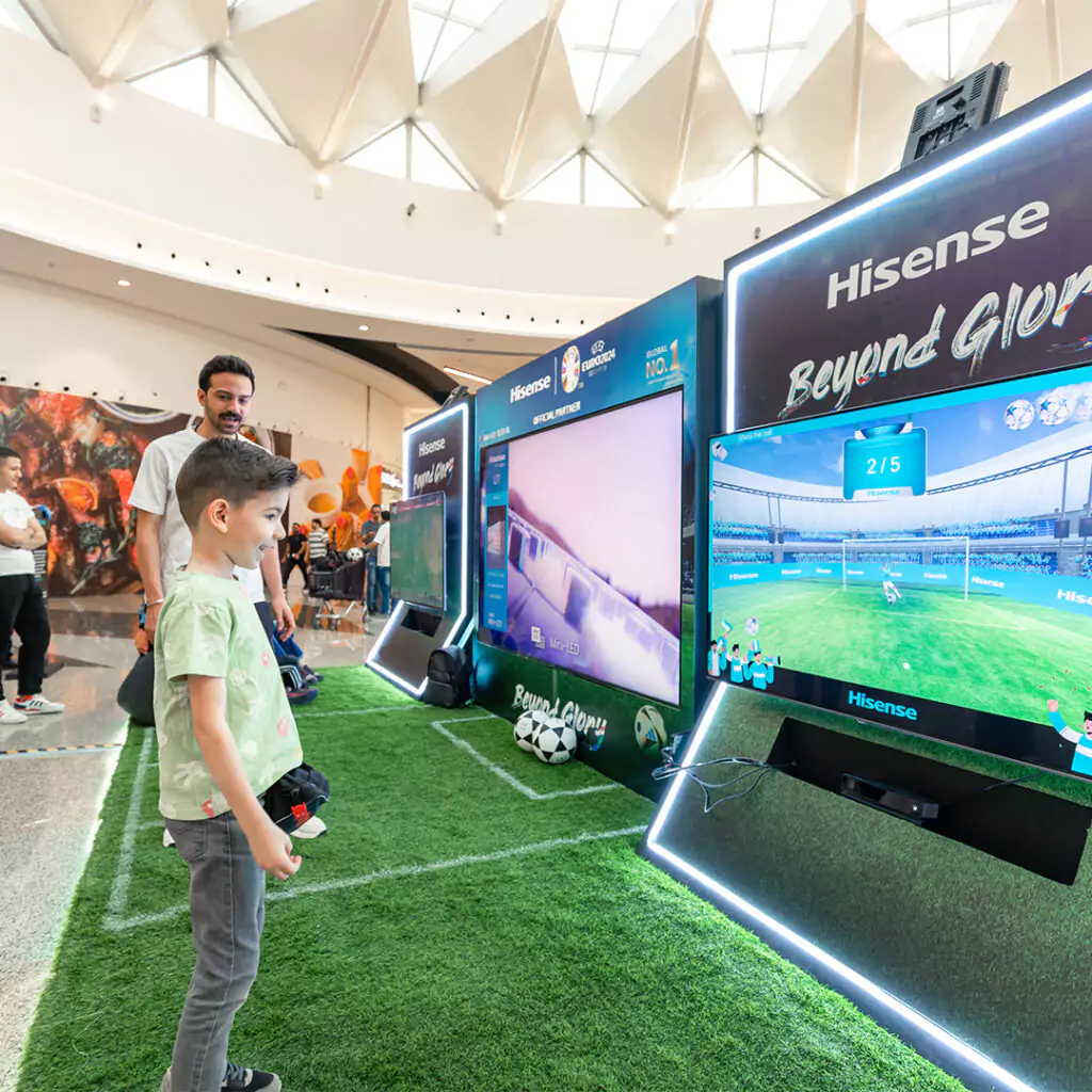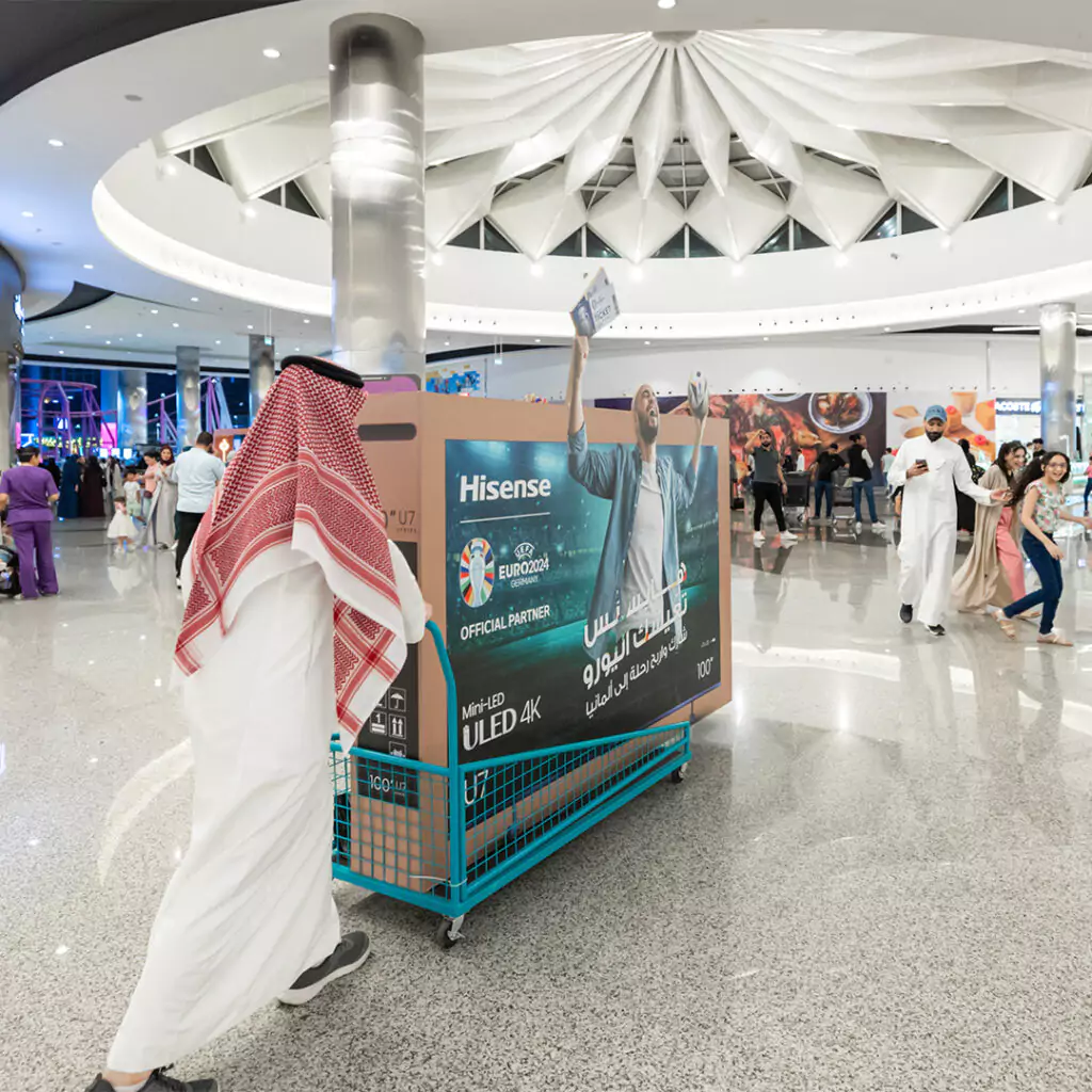 We kicked off the Euro Cup campaign with a striking teaser: a 100-inch roaming TV box that toured the malls of Riyadh. This visually captivating element generated significant buzz, attracting large crowds and setting the stage for the campaign’s main activities.