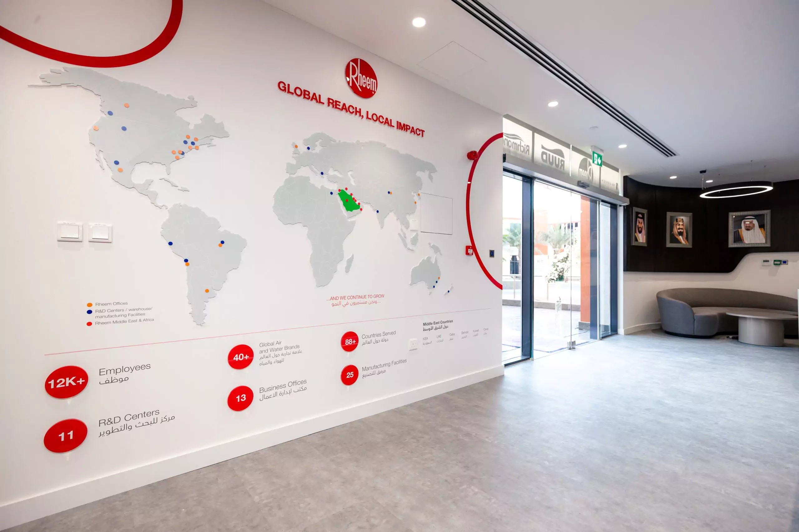 To reflect Rheem’s evolving identity following recent acquisitions across Riyadh, we designed and implemented a cohesive branding strategy for both their offices and the International Learning Center (ILC). This included comprehensive office and showroom branding, along with handling the production and installation processes.