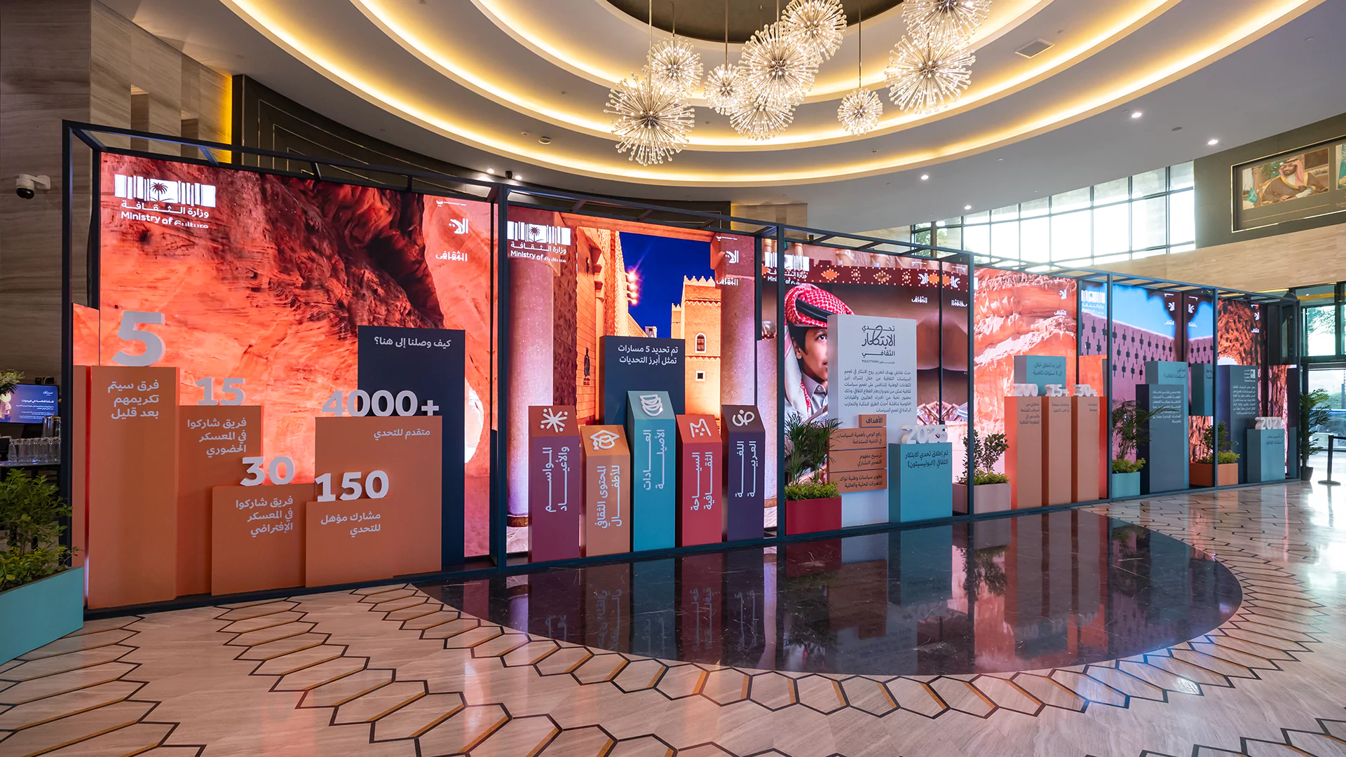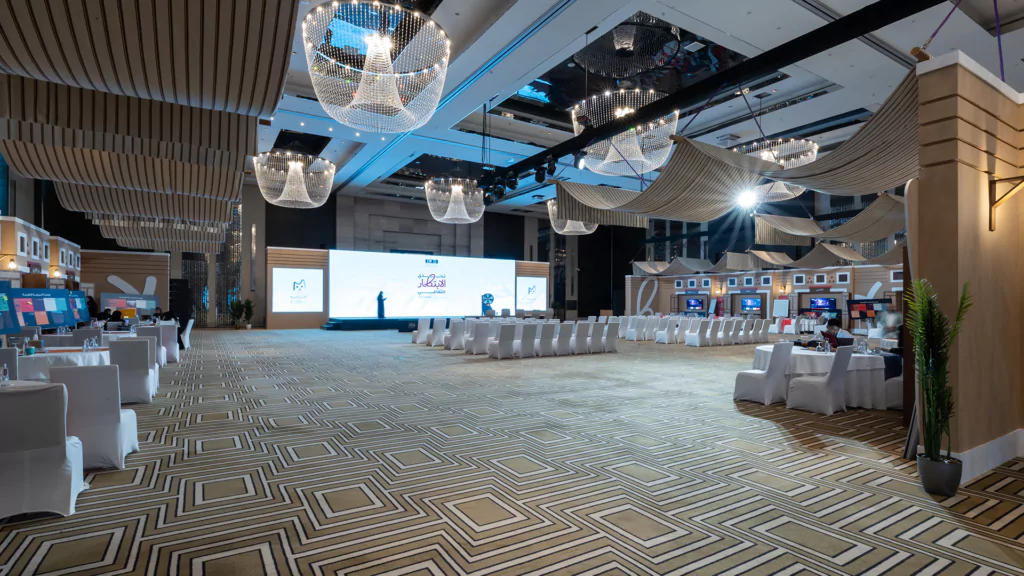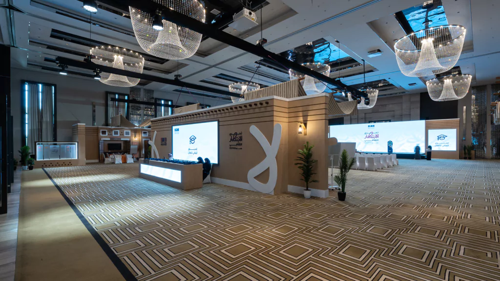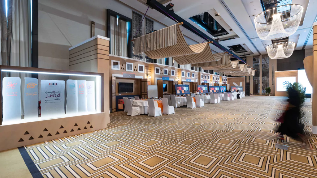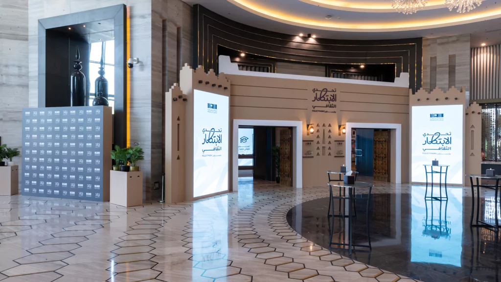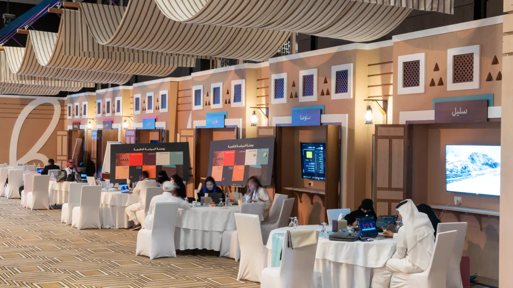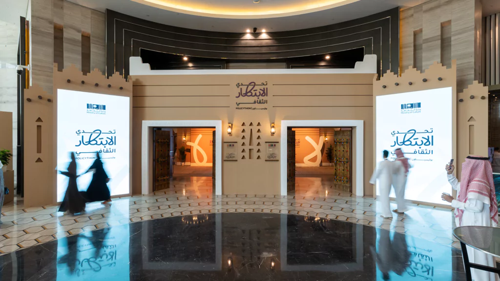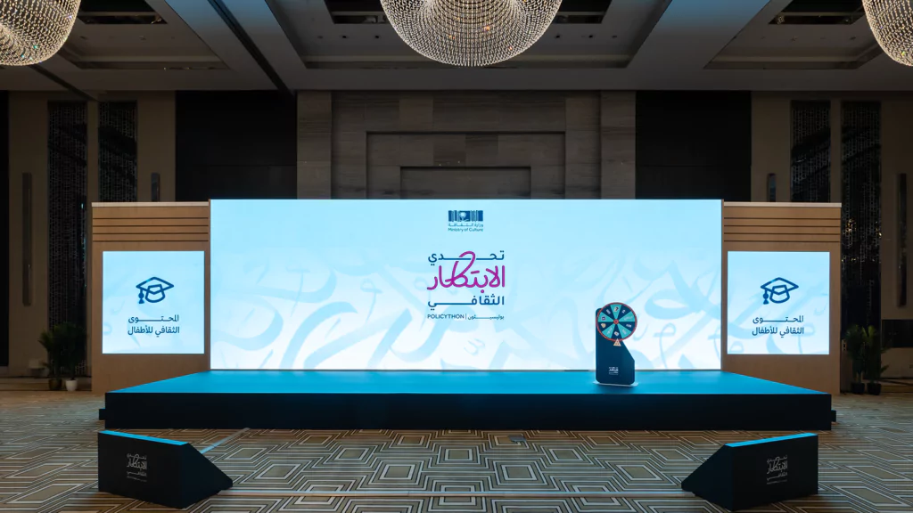 Held over two immersive days, the cultural policy bootcamp served as a key platform for developing final ideas and selecting five standout teams to compete at the final stage. Dice was responsible for the entire experiential and spatial design, transforming the venue into an innovation-driven, Saudi-inspired space. This included branded collaboration zones, media walls, a custom judges’ area, and 15 interactive digital exhibition booths equipped with live streaming setups. From stage design and cultural theming, like Najdi doors and Sadu fabric accents, to branded materials and authentic Saudi hospitality, we created an environment that was both functional and emotionally resonant.