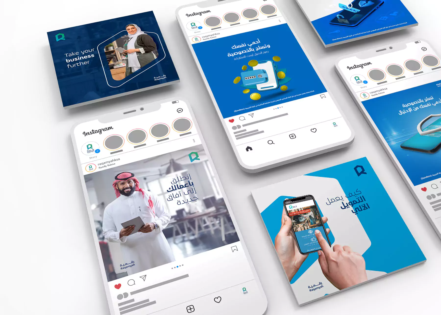 With Raqamyah established in the Saudi market, there was a need to regulate its positioning and cultivate a fresh new look that mirrors its growth and standing in the fintech industry. The creative team successfully revamped the old logo, aligning it with Raqamyah’s future goals and imparting the brand with an impressive new outlook. Afterward, the focus shifted to the formulation of comprehensive brand guidelines. This step was crucial in defining how the brand would seamlessly transition into both physical and digital spaces, establishing a consistent and meaningful brand experience for Raqamyah Platform’s customers.
